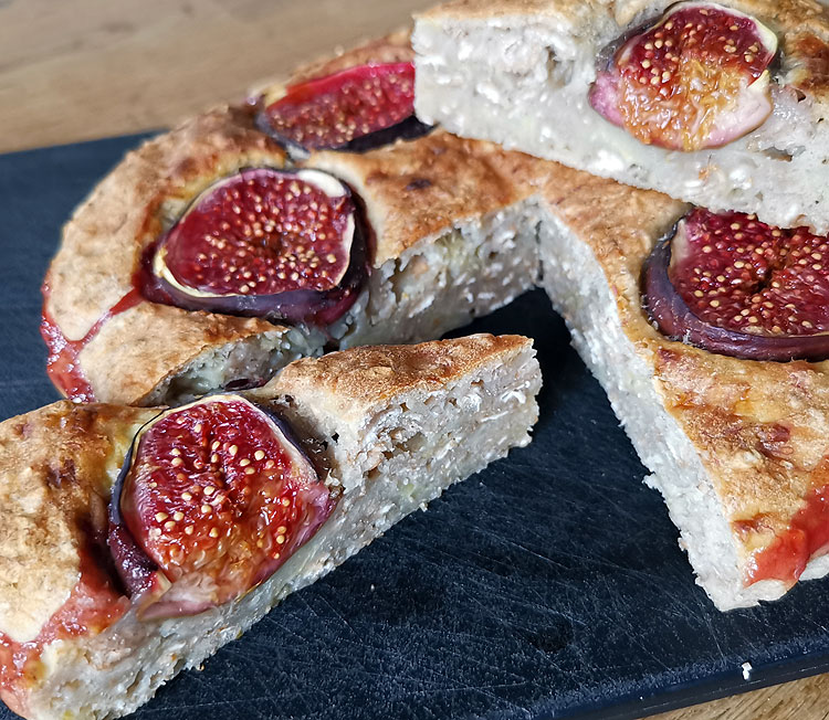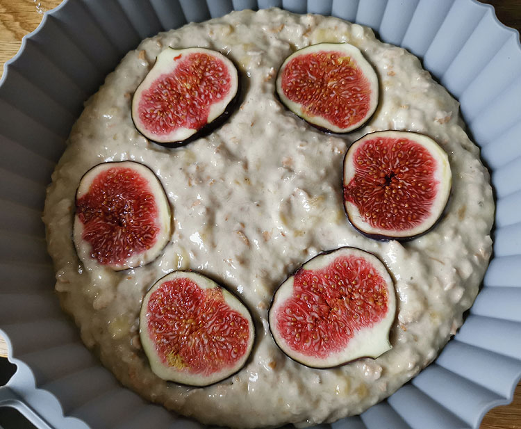 Выкладываем массу для бананового хлеба в форму. Свежие фиги разрезаем на половинки и утапливаем в массе теста.