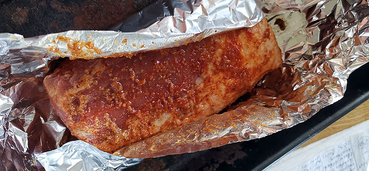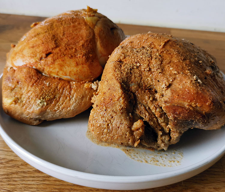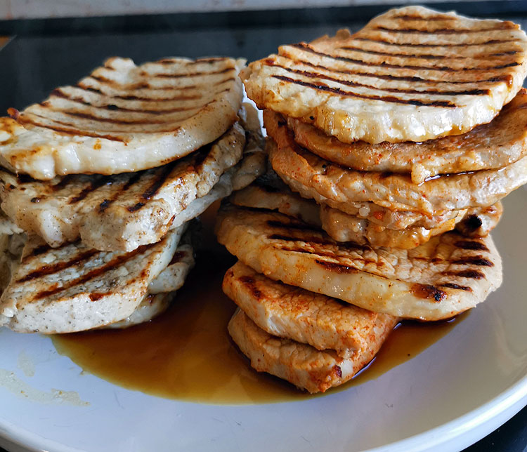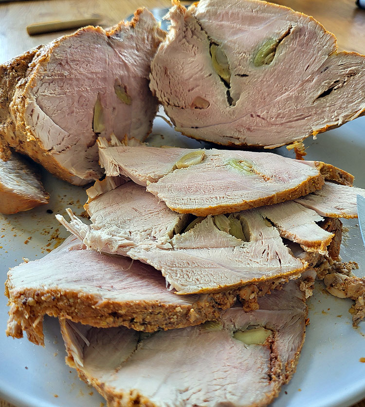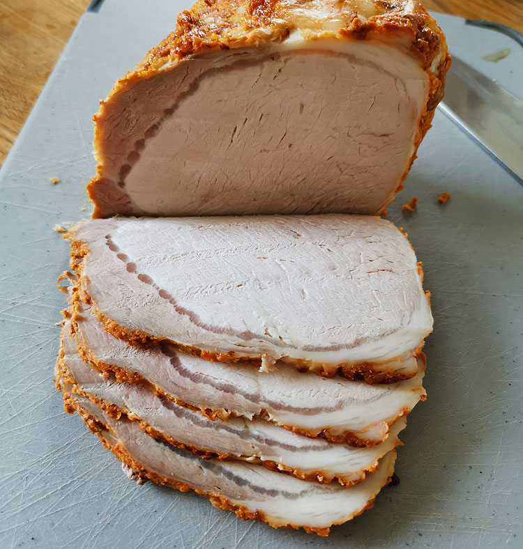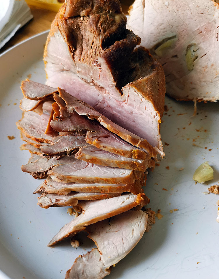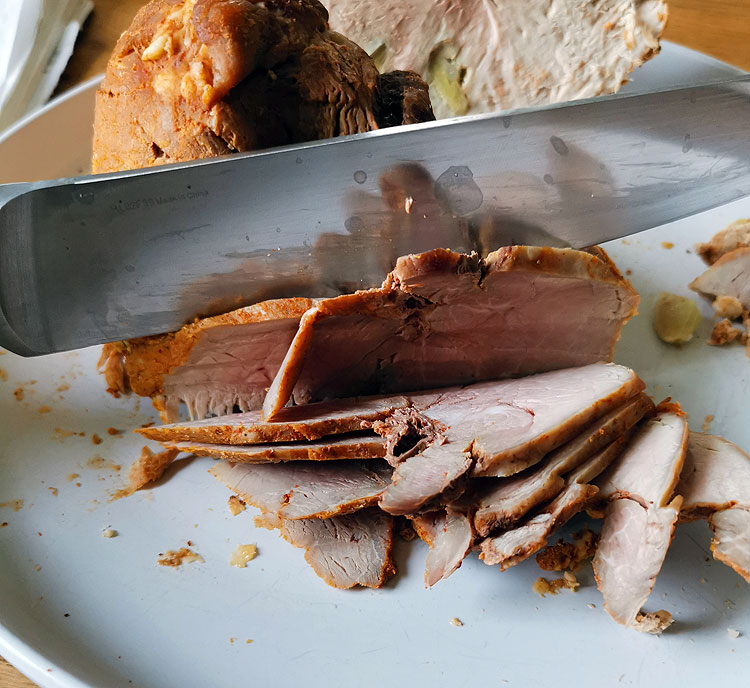 Оно тоже изумительно тоненько режется после охлаждения. Мой муж вообще все подряд греет (даже банановый хлеб может погреть перед едой) – но эти оба мяса спокойно ел холодным как колбасу из холодильника.