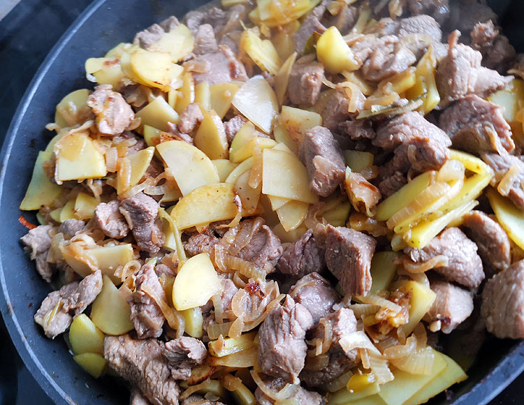 (Ну, это как бы лазанья, только на русский лад).Для рязаньи. Пожарить много лука, добавить к луку фарш, жарить вместе, пробивая фарш от комочков, добавить томатную пасту, соль, специи, лавровый лист (по желанию). Жарить, пробивая фарш от комочков, пока количество жидкости не уменьшится.
