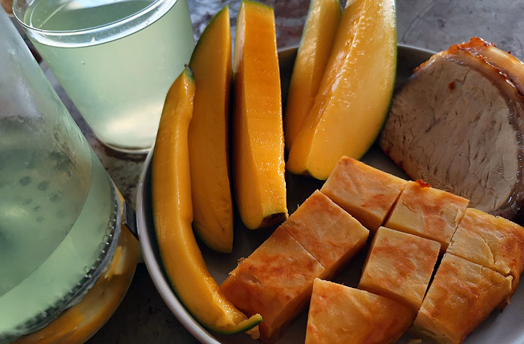 А вот тут -- один из завтраков. Поскольку это завтрак -- не радлер, а просто лимонад. Плюс испанская тортилья. Плюс манго. Плюс мясо, запеченое куском. Мяса там на самом деле большие три куска -- но почему-то манго его на фото затмило.