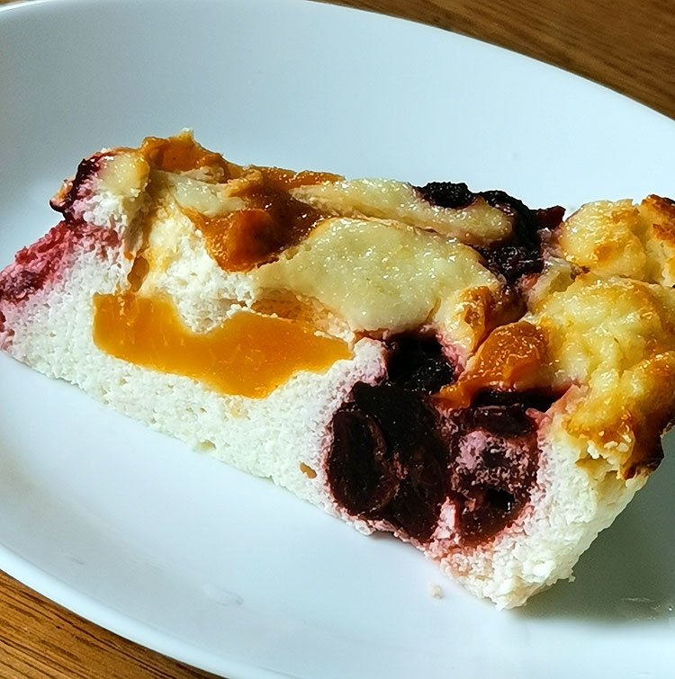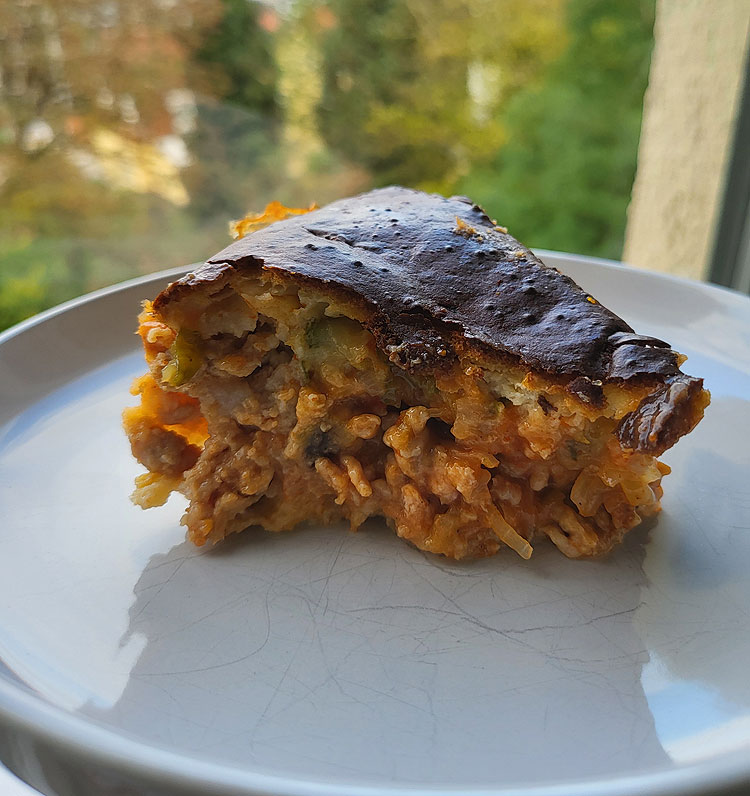 Ну, и хотя в горячем виде пирог у меня не накладывался, а расползался – по вкусу все получилось просто офигительно. Когда пирог остыл – стал резаться кусками и накладываться.