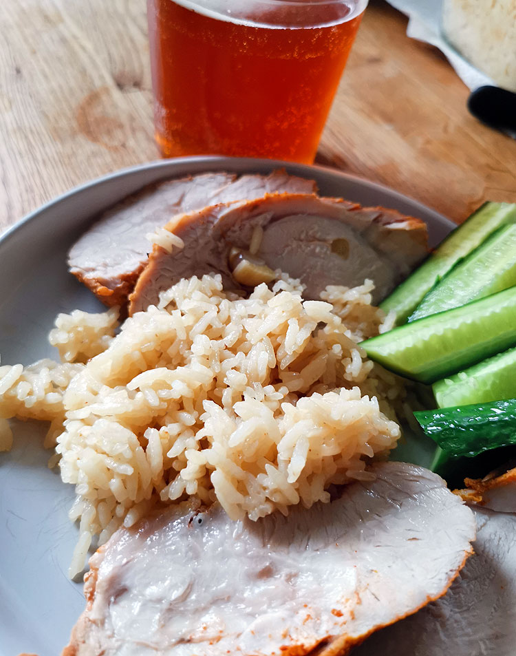Ну, и еще раз подача. Свинина куском, рис, и, конечно, радлер!