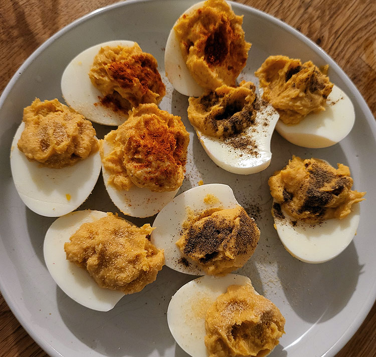 В Испании желток смешивают с консервированным тунцом. Тунец или сразу в томатном соусе, или же эту смесь тунца с желтком сдобрить кетчупом. Еще можно майонеза для нажористости (но это опционально). Украшают обычно оливками. И это считается традиционная закуска на застолья.