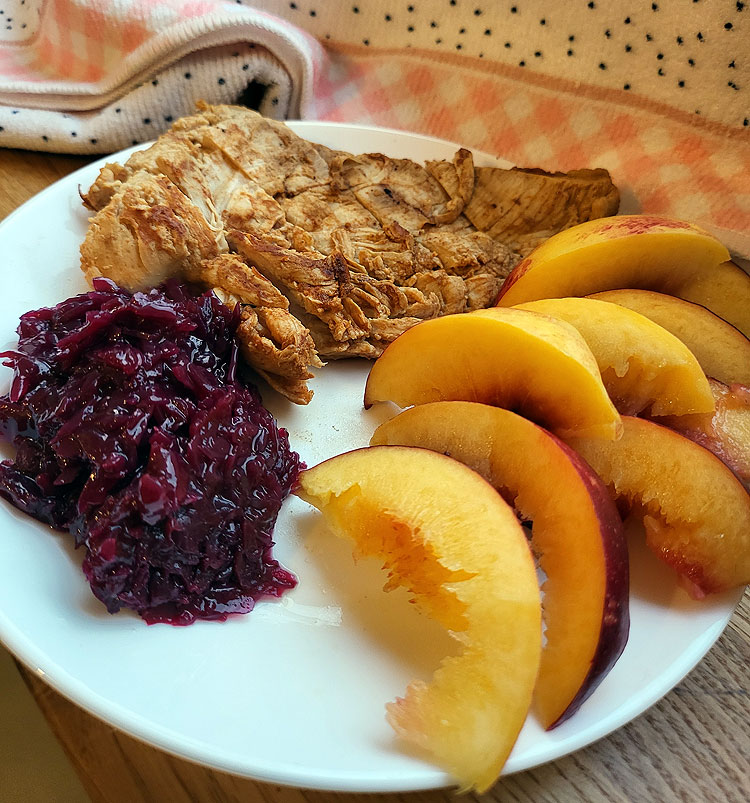 А можно добавить немножко гарнира. Тут на гарнир нектарин и соленая красная капуста (мы же в Германии).