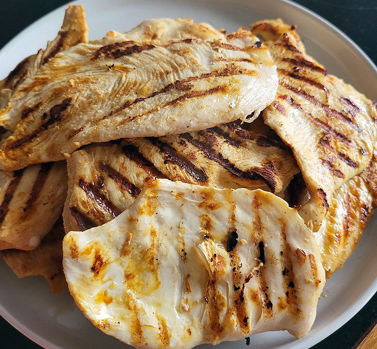 Если мясо не запекать, то можно пожарить. Т.к. у меня есть сковорода-гриль, я жарю на ней (практически без масла). Вот это -- курица.