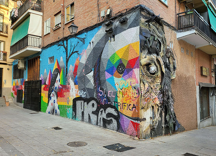 Мы жили в Мадриде в таком районе, который и исторический с одной стороны, и достаточно центральный, но зато там много граффити. В Мадриде есть очень качественное и крутое граффити. Прямо супер. Вот, например. Частично рисунок, частично скульптурная композиция.