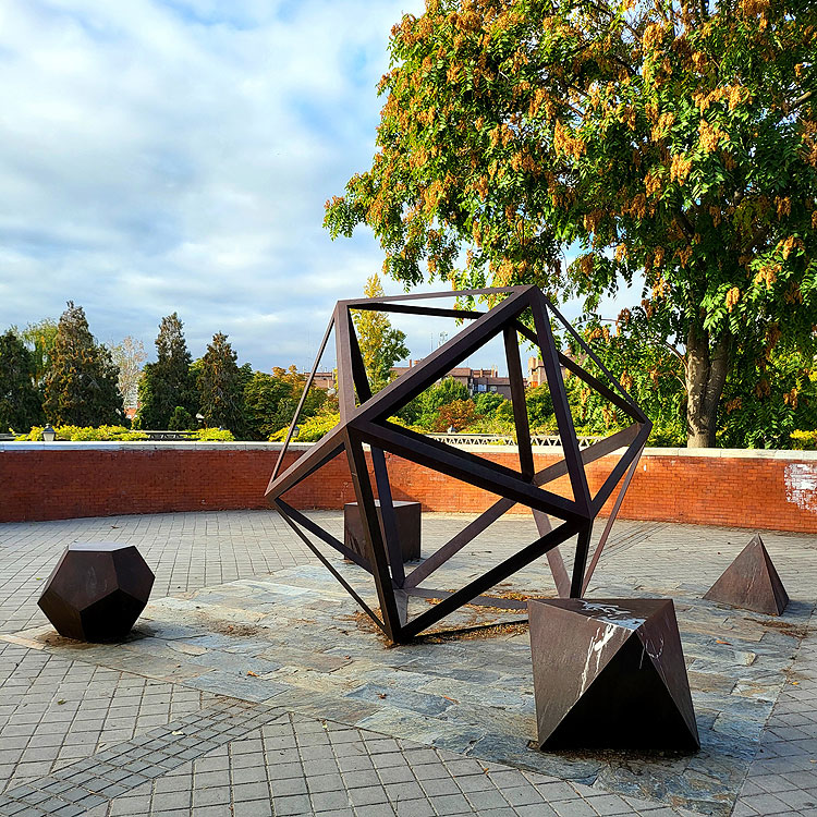 А это, может, не то, чтобы прямо шедевр какого-то творчества. Но мое математическое сердце радуется: серия скульптур “Платоновы тела” (одно тело в центре, побольше, все остальные вокруг – и так композиции, посвященные всем пяти телам).