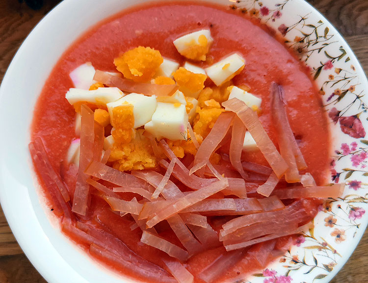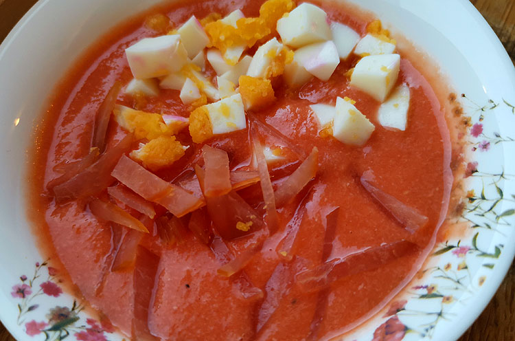Суп очень освежающий. Для жары он, конечно, идеален, но мне очень хотелось приготовить по еще свежим воспоминаниям. У меня получилось очень вкусно. Лично для меня вышло идеально – чуть более остро, чем было в Кордове, но на мой вкус так даже вкуснее. А вот хамон иберико с его ярким вкусом тут был бы втемашнее того мяса, которое я положила. Но вообще-то в целом можно вообще подавать и без яйца, и без мяса.