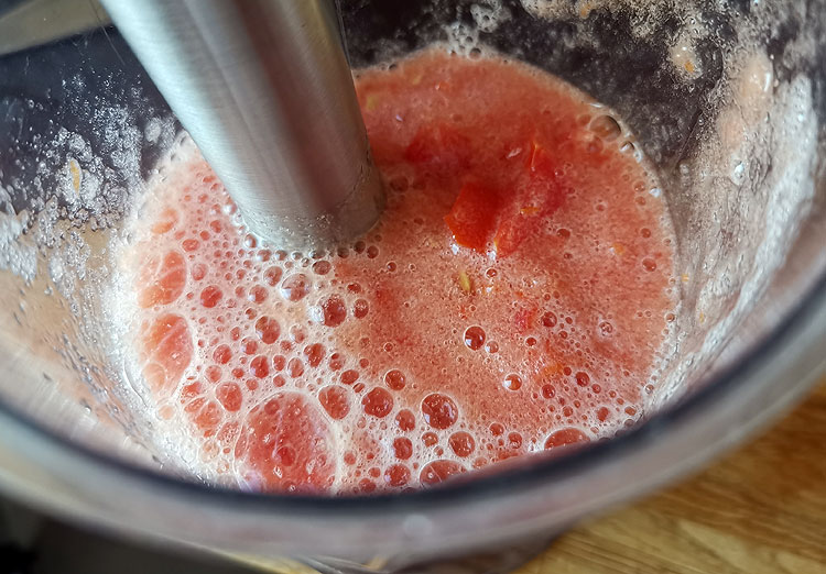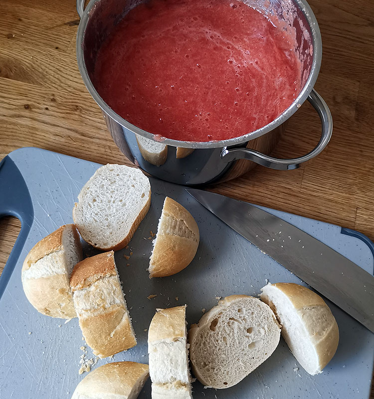 Это холодный суп, отлично подходящий для испанской жары. Но мы сегодня ели в мюнхенском холоде – и, знаете, тоже отлично идет!