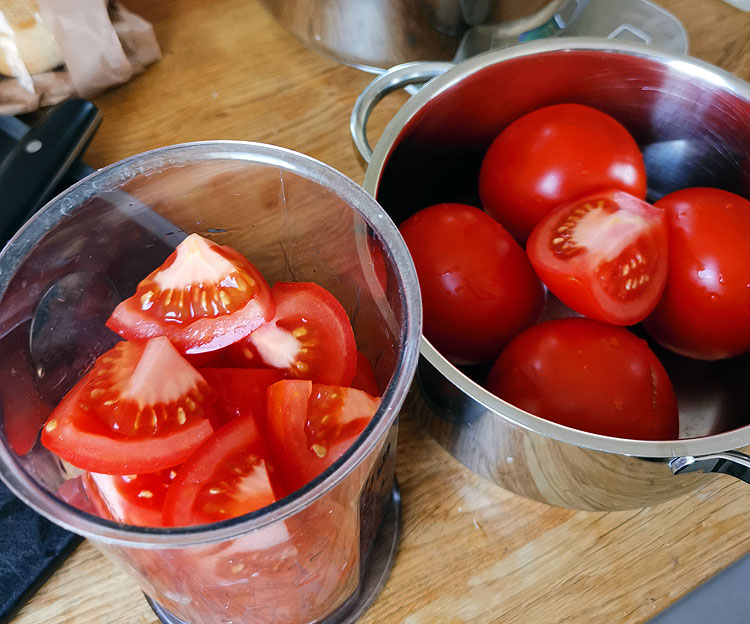 Ага, сюда же выдавить из чеснокодавки 1 зубчик чеснока и добавить 10 грамм соли. Я соли добавила 15 грамм – не сильно солено вышло (10 мне показалось на вкус мало). А чеснок я пропустила через блендер вместе с помидорами (потом протирала через сито). И поэтому чеснока я взяла 2 зубчика, а не один.