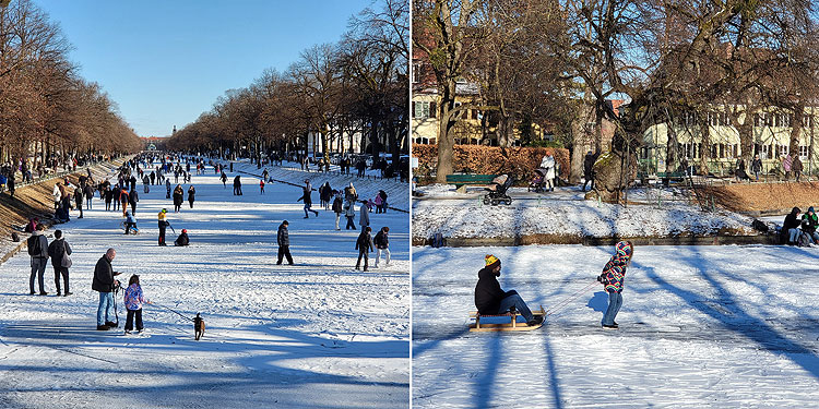 Главное место серфинга, известная достопримечательность пропала -- но мюнхенцы знают другое место, где серфят! - Когда лежит снег? -- пару недель в году, примерно в январе. Но периодически выпадает на один-два дня с ноября по начало марта.