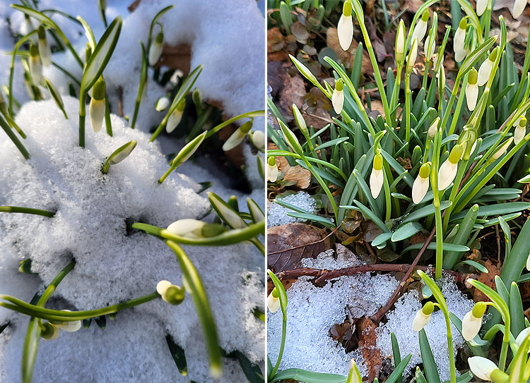 К концу февраля начинают цвести подснежники. Причем, начинают проклевываться именно из-под снега. Так мило. На фото 20 и 28 февраля прошлого года.