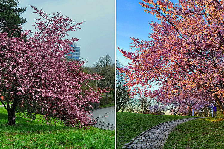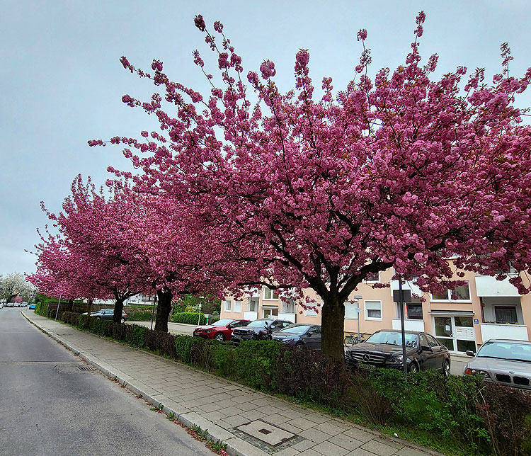 К концу марта – цветение сакуры. Все мюнхенцы знают метса, где сакура высажена, знают удобные ракурсы для фотографирования. И цветение сакуры – что-то совершенно невероятное. Цветет примерно в последней неделе марта – в первой неделе апреля.