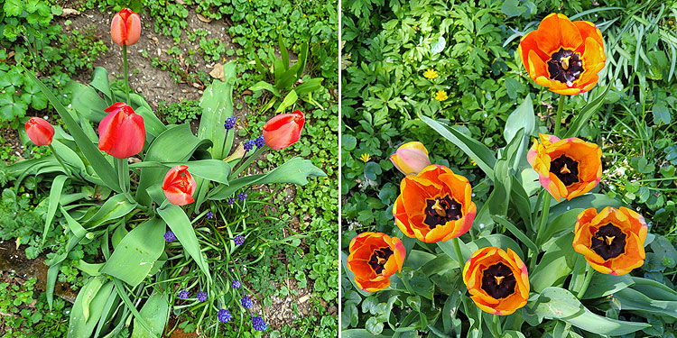 К середине апреля подключаются цветующие сливы и тюльпаны. Тюльпаны абсолютно дикие, на каждом газоне– в нашем дворе, например, самые красивые тюльпаны возле помойки.