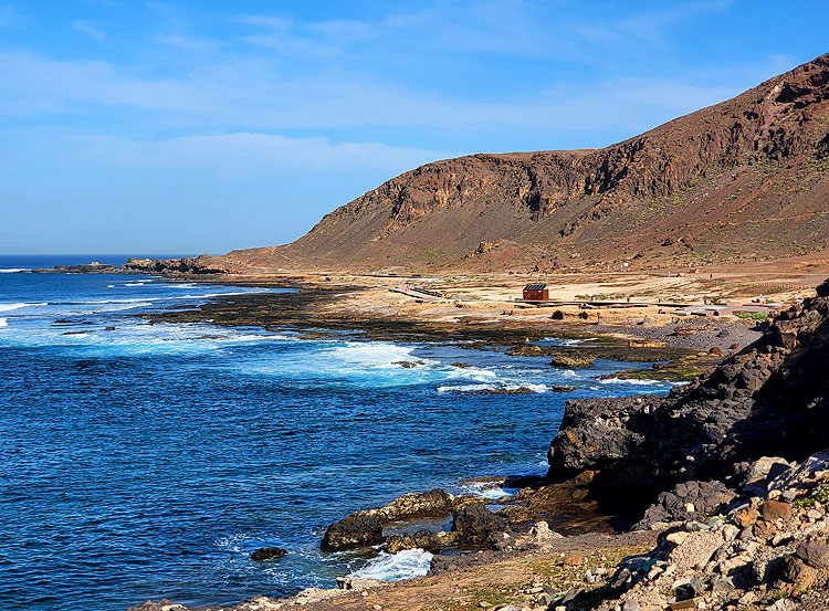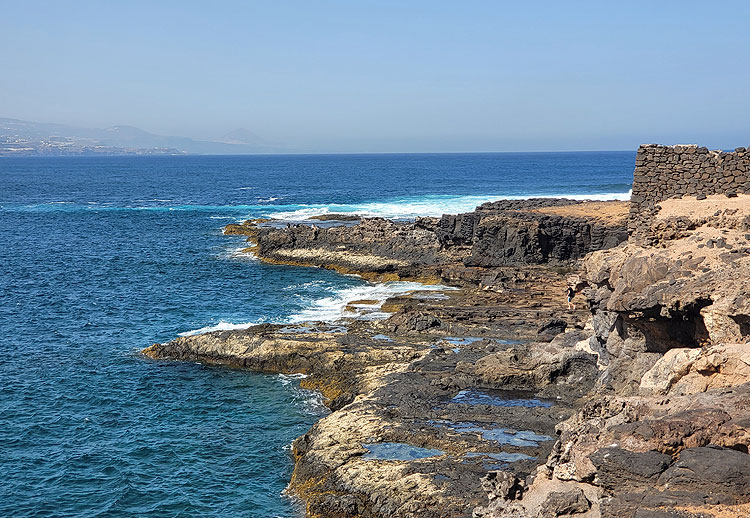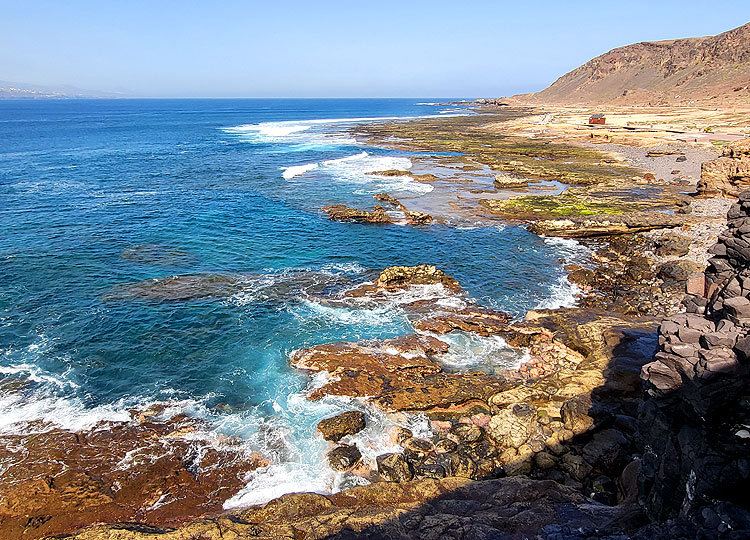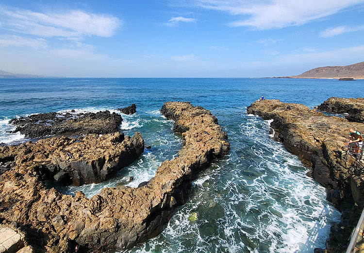 Вид с высоты на бухту, в которой расположен пляж Кантерас, который по праву считается одним из самых классных пляжей Европы (хотя и расположен почти в Африке). Волн там меньше (потому что закрыт со всех сторон, да еще и прямо сам пляж огорожен рифом – такой естественный природный волнорез, волны разбиваются).
