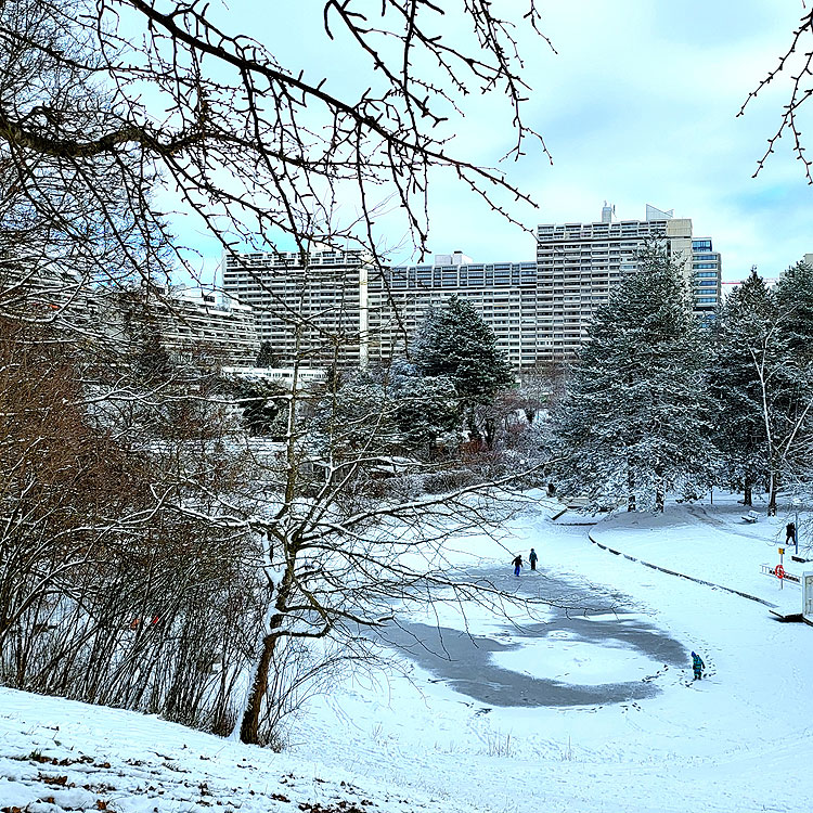 Возле Олимпийского парка построен большой жилой массив. Мне нравится там гулять и смотреть на него просто как на пример интересного обычного городского района. Много фонтанов, есть пара приличных закусочных. Район примерно 70-х годов. Обычный спальный район, но с характером.
