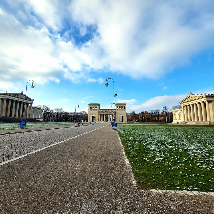 А с другой стороны от Одеон-плац можно пойти побродить вдоль Бриеннерштрассе. По Бриеннерштрассе в целом скоро наступит неинтересно, но потом опять интересно — Кёнигсплац, Королевская площадь. Мне она почему-то и сама нравится (хотя поражает она, скорее, своим масштабом, у нее нет фотографических видов), и тут рядом эпицентр самых знаковых мюнхенских музеев (Старая пинакотека, Новая пинакотека и еще с полдюжины). А еще тут университетский район, тусуются студенты и опять же есть интересные закусочные.