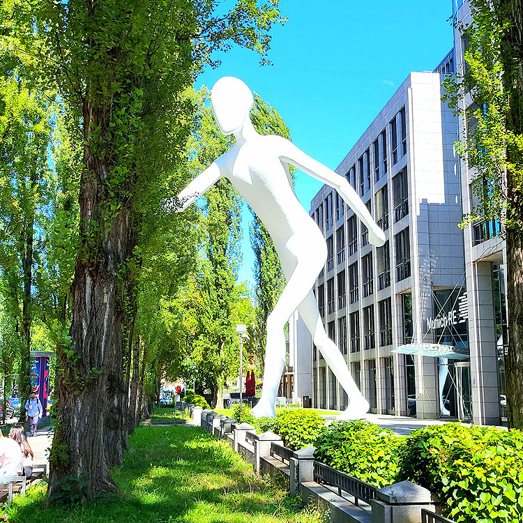 Первый офис моего мужа располагался в здании, соседнем с этим чуваком. Мы приехали на метро, вышли — и поняли, что Мюнхен очень интересный город. Короче, я очень рекомендую бродить вдоль Леопольдштрассе от Триумфальной арки до станции метро “Мюнхенская свобода” (Münchner Freiheit). На этой самой “свободе” бывает иногда какая-то движуха и даже иногда уличная еда. Если углубляться по сторонам, то с одной стороны там скоро Английский парк (и как раз Китайская башня), а с другой очень интересный для прогулок район, но без ярких достопримечательностей. Застройка самое позднее – начало 20 века, а в основном раньше, но просто жилые дома. Просто ходишь и интересно. В Мюнхене таких районов, в которых просто интересно бродить куда глаза глядят, много, их все не обойти. Даже в этом посте есть три – (в этом пункте, Борстай и Олимпийский) – все три с разным характером, из разных эпох.