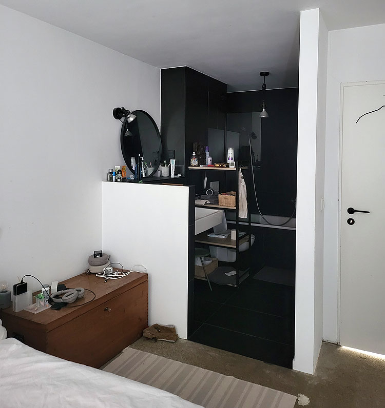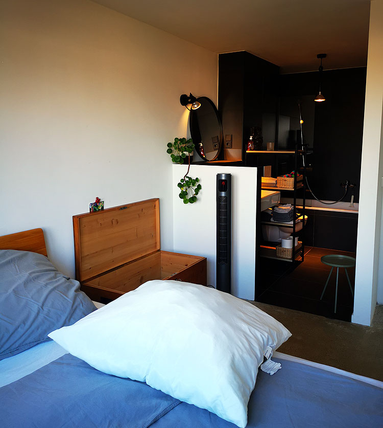 Спальня совмещена с ванной комнатой, между ними нет стены или двери или даже прозрачной перегородки.